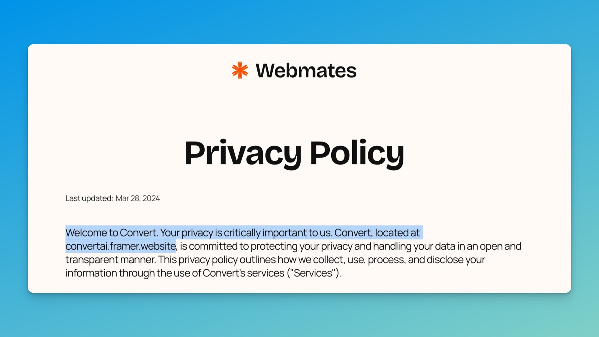 This discovery highlights a significant inconsistency between Webmates.io’s marketing and their own business practices. They opted for a popular Framer template called "Convert" to design their own site, raising concerns about the consistency between their indirect marketing claims and their actual practices.