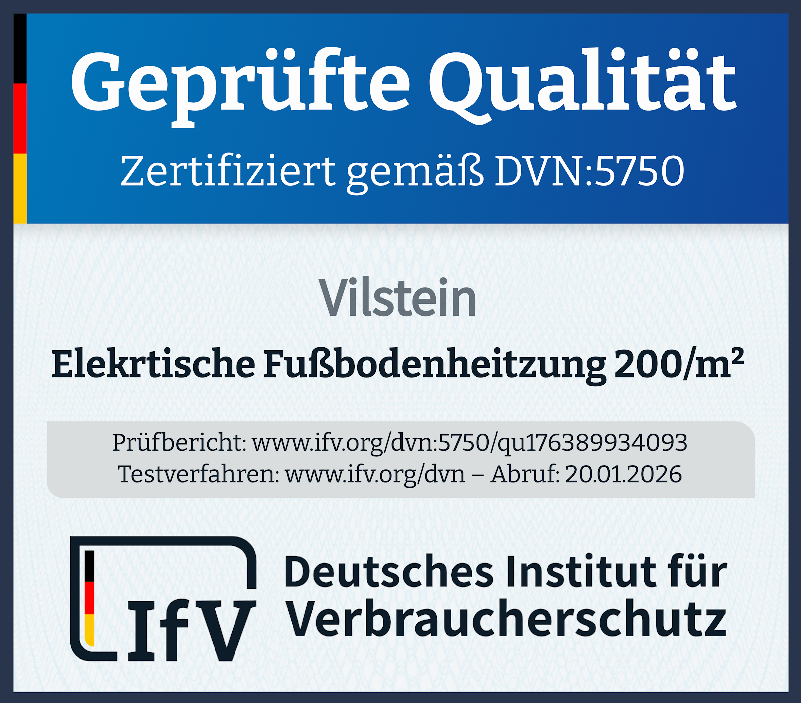Unsere Zertifizierungen setzen Maßstäbe und schaffen Sicherheit – für Verbraucher und Unternehmen gleichermaßen. Jedes geprüfte Produkt und jede zertifizierte Dienstleistung ist ein Schritt zu mehr Transparenz und Vertrauen in den Markt. Beim IfV arbeiten wir täglich daran, höchste Standards zu gewährleisten und eine verlässliche Orientierung für alle zu bieten.